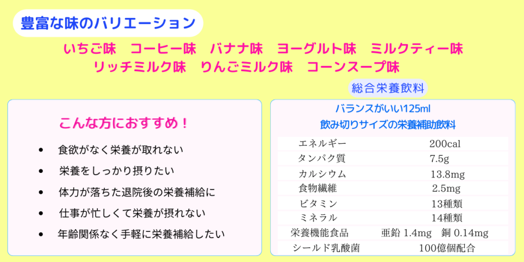 多彩なフレーバーには、いちご味・コーヒー味・バナナ味・ヨーグルト味・ミルクティー味・リッチミルク味・りんごミルク味・コーンスープ味があり、バランスの取れた飲み切りサイズ(125ml)で食欲がないときや栄養バランスが偏っているとき、退院後の体力回復が必要なとき、仕事が忙しくて食事の時間が取れないときでも、片手で簡単にバランスの良い栄養を摂取することができます。